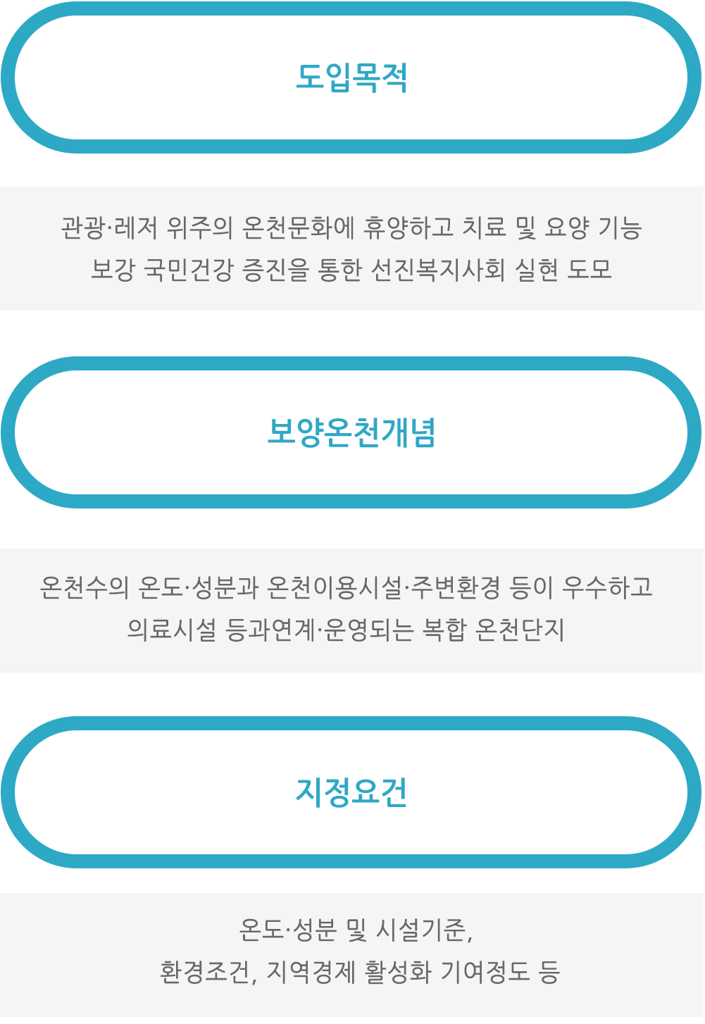 온천수는 35℃ 이상이거나 25℃이상인 경우 유황·탄산 등 인체에 유익한 성분을 1000㎎/ℓ이상을 함유하여야 하며, 건강시설·숙박시설 및 의료시설 등을 갖추고, 주변환경을 쾌적하게 지속적으로 관리해야 한다.